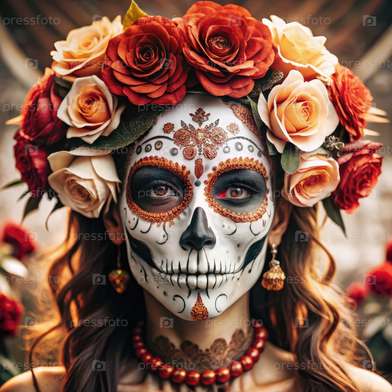 Празднование Дня мертвых с яркими цветами и сложным макияжем черепа