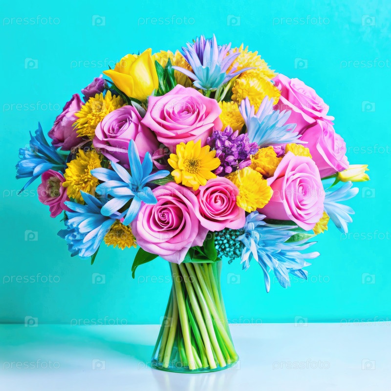 Яркий букет агапантусов, оксипеталов и роз на бирюзовом фоне