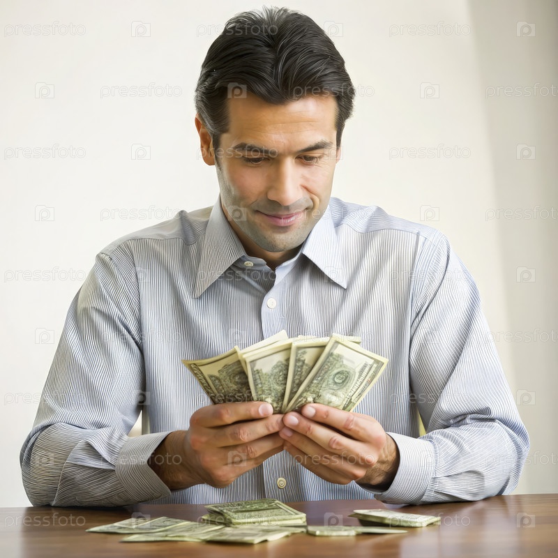 Человек, считающий деньги за столом в хорошо освещенной комнате днем