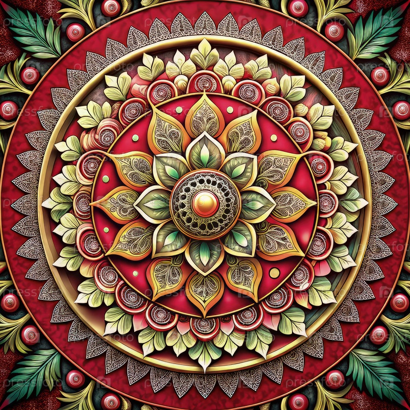 Сложный дизайн мандалы с ярким красным фоном и цветочными элементами