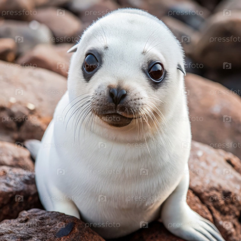 Милый белокожий тюлен, отдыхающий на скалистом берегу в яркий солнечный день