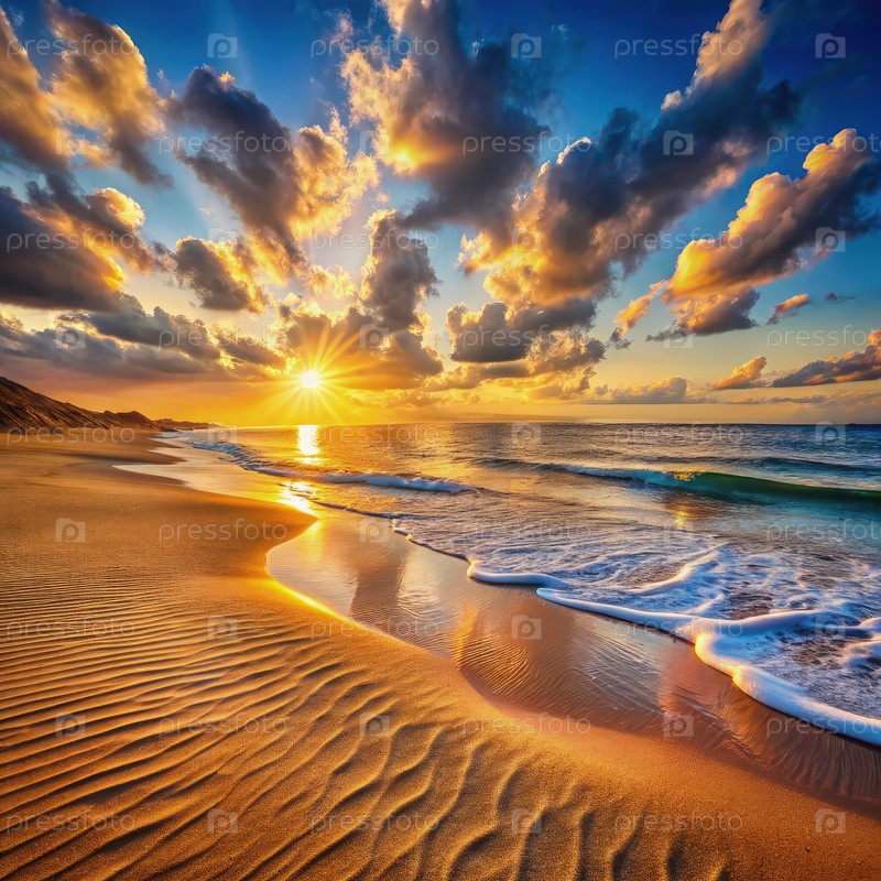 Золотой восход солнца над тихим песчаным пляжем с нежными волнами и красочными облаками