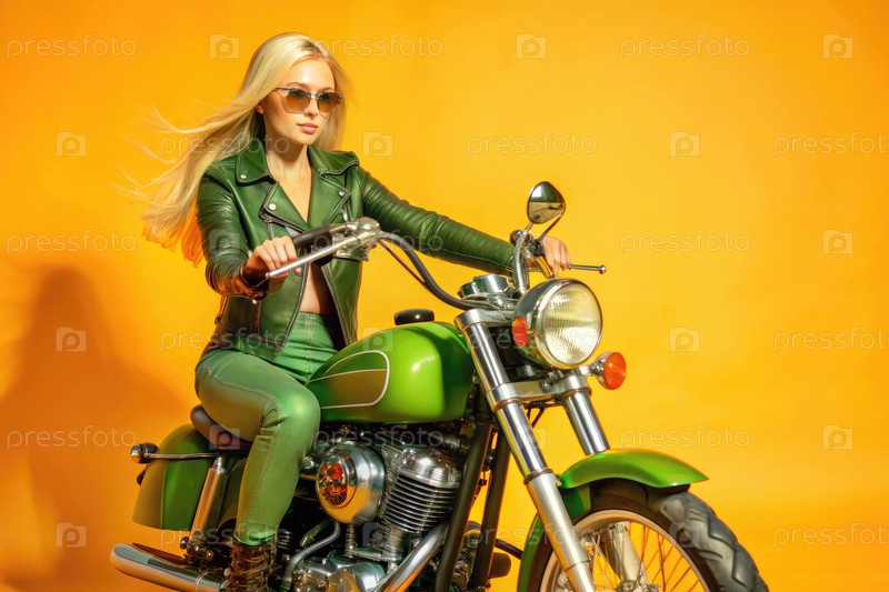 Блондинка едет на зеленом мотоцикле на ярко-оранжевом фоне