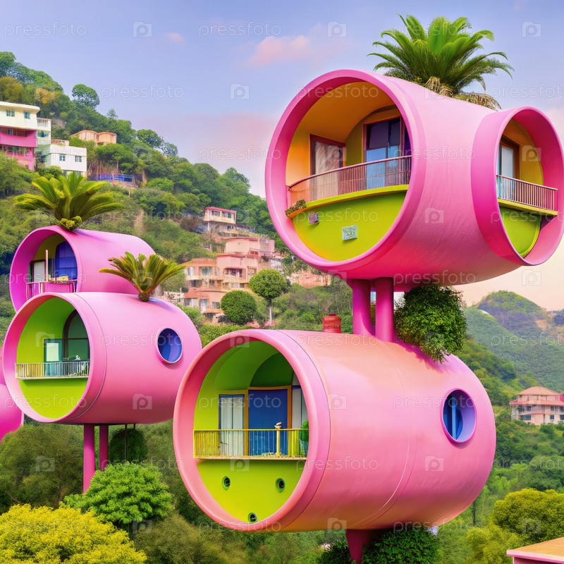 Футуристические закругленные дома с яркими цветами и зеленой средой в живом ландшафте