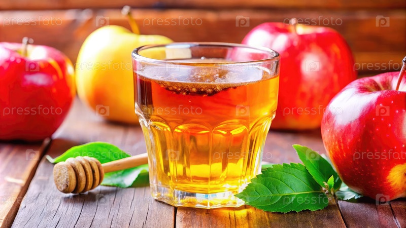 Винтажный стакан яблочного сидра с богатым медом и свежими яблоками на деревянном столе