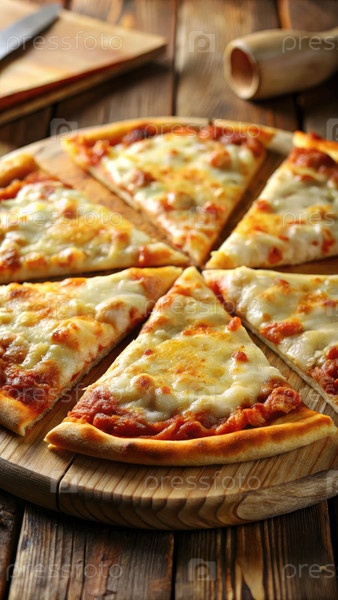 Вкусная стандартная пицца с сыром, нарезанная для совместного использования на деревянном рустическом столе