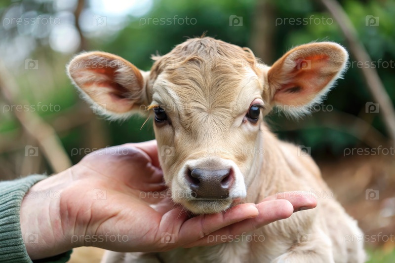 Милая маленькая корова, нежно отдыхающая в руке окруженная природой