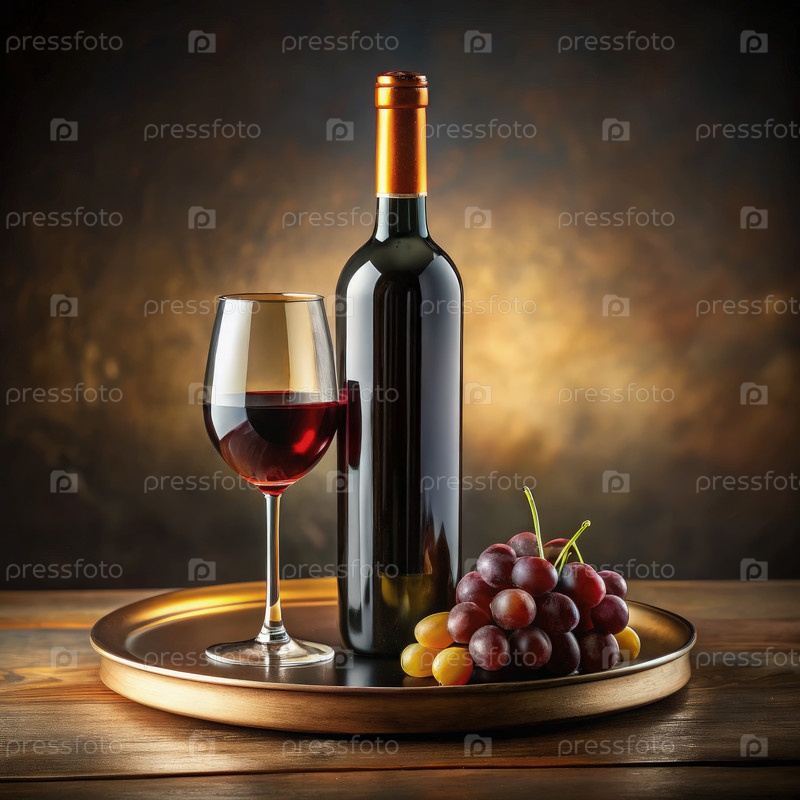 Потрясающая бутылка красного вина со стаканом и виноградом на деревянном столе