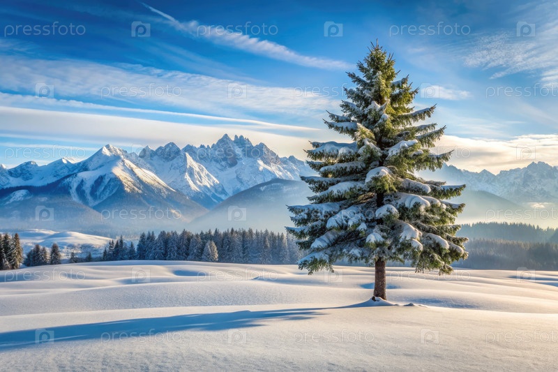 Одинокая сосна в снежном лугу на фоне величественных гор