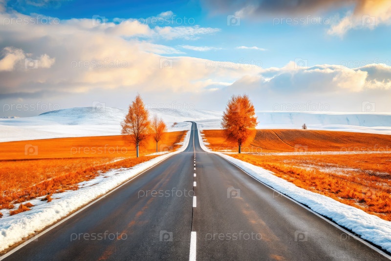 Спокойный осенний пейзаж с извилистой дорогой и яркими деревьями на закате