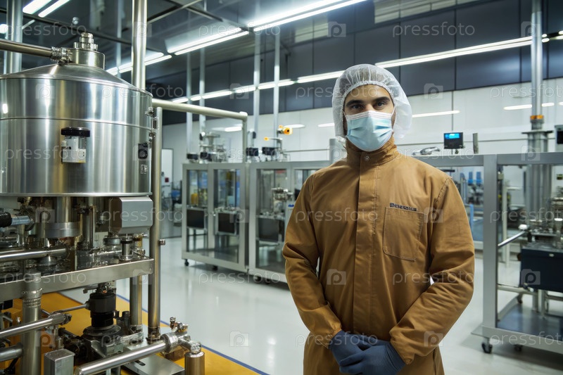 Работник биотехнологического объекта в чистой комнате, работающей по стандартной шкале белка