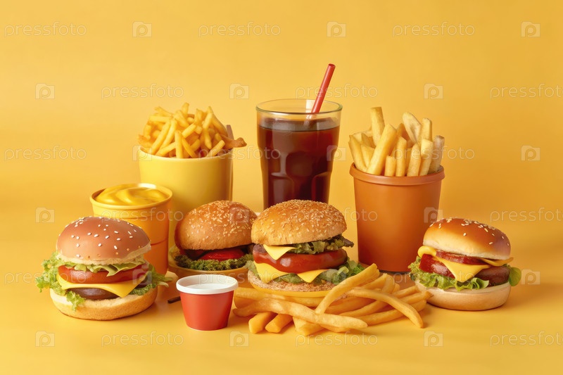 Разнообразные продукты быстрого питания, отображаемые на белой шкале на желтом фоне