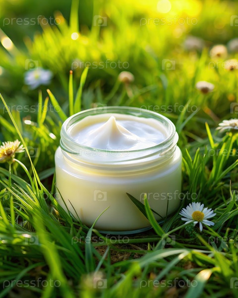 Банка с кремом для рук помещена на траву, в окружении ромашек под естественным солнечным светом
