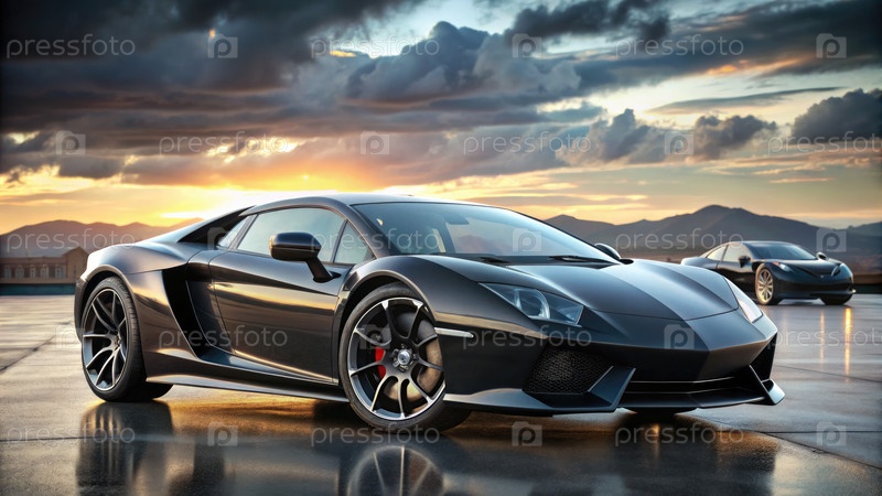 Гладкий черный суперкар, припаркованный на фоне заката солнца в живописном месте