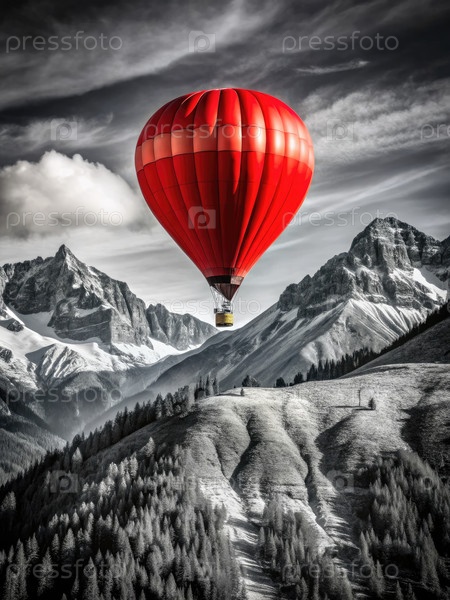 Потрясающий красный воздушный шар плавает над величественными горами