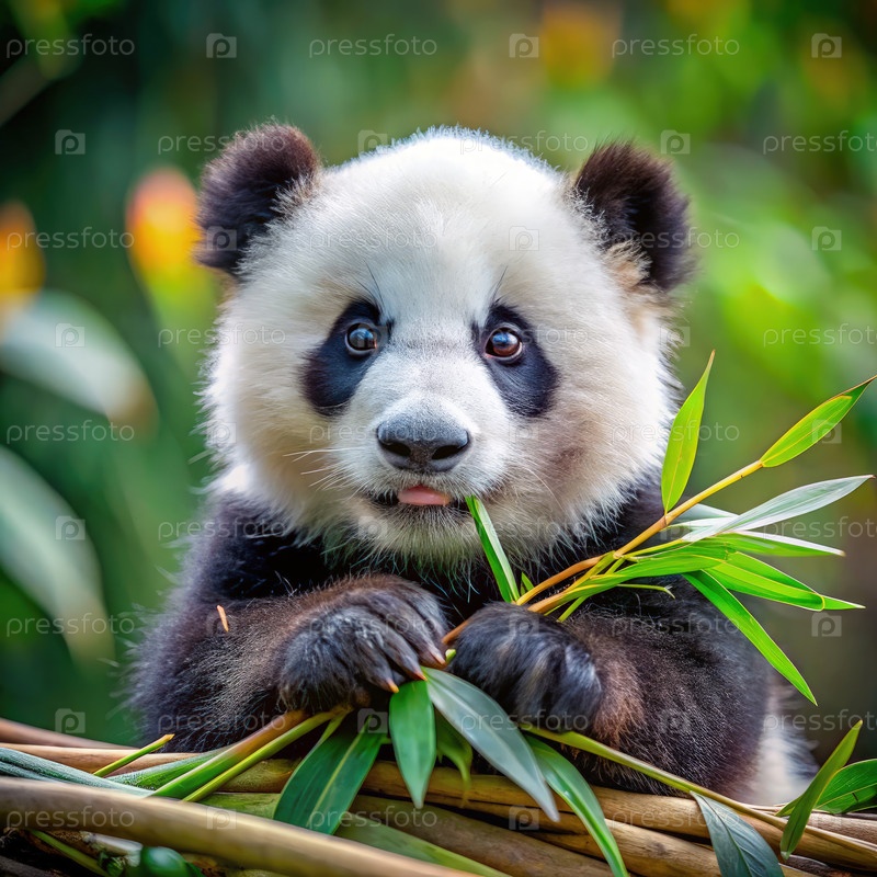 Милая маленькая панда ест листья эвкалипта в пышной зеленой среде