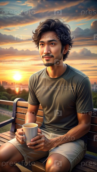 Мужчина, наслаждающийся теплым напитком на скамейке в парке во время заката солнца в городском ландшафте