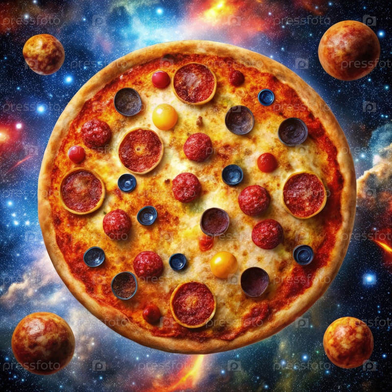 Концепция вселенной пиццы, в которой представлена пицца стандартного масштаба в космической обстановке