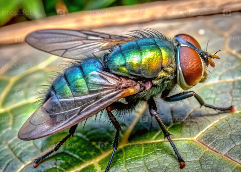 Детальный крупный план красочной мухи, отдыхающей на листе в естественном солнечном свете