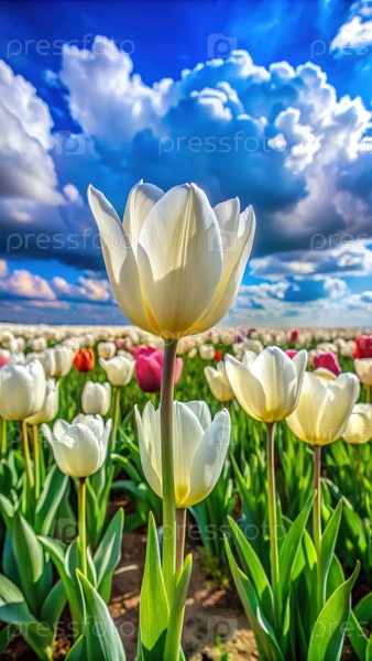 Живое поле тюльпанов под чистым голубым небом с пушистыми белыми облаками