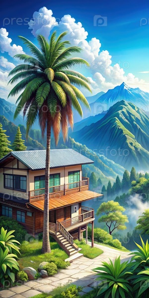 Горный дом с пальмами, окруженные пышной зеленью и далекими вершинами