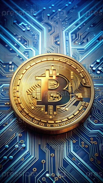 Близкий взгляд на криптостандартную шкалу, изображающую биткоин на плате схемы