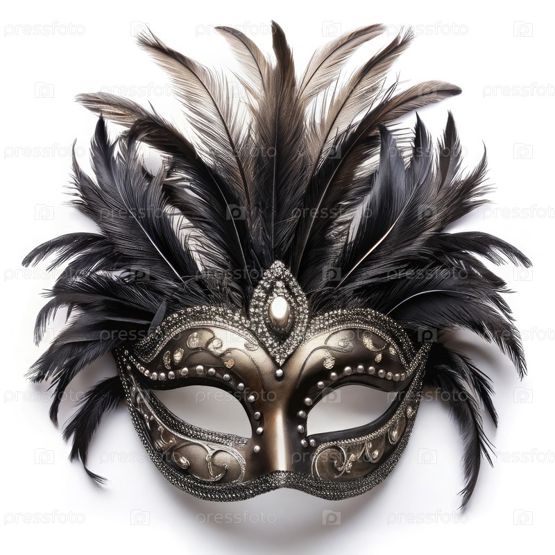 Элегантная черная карнавальная маска с перьями на белом фоне