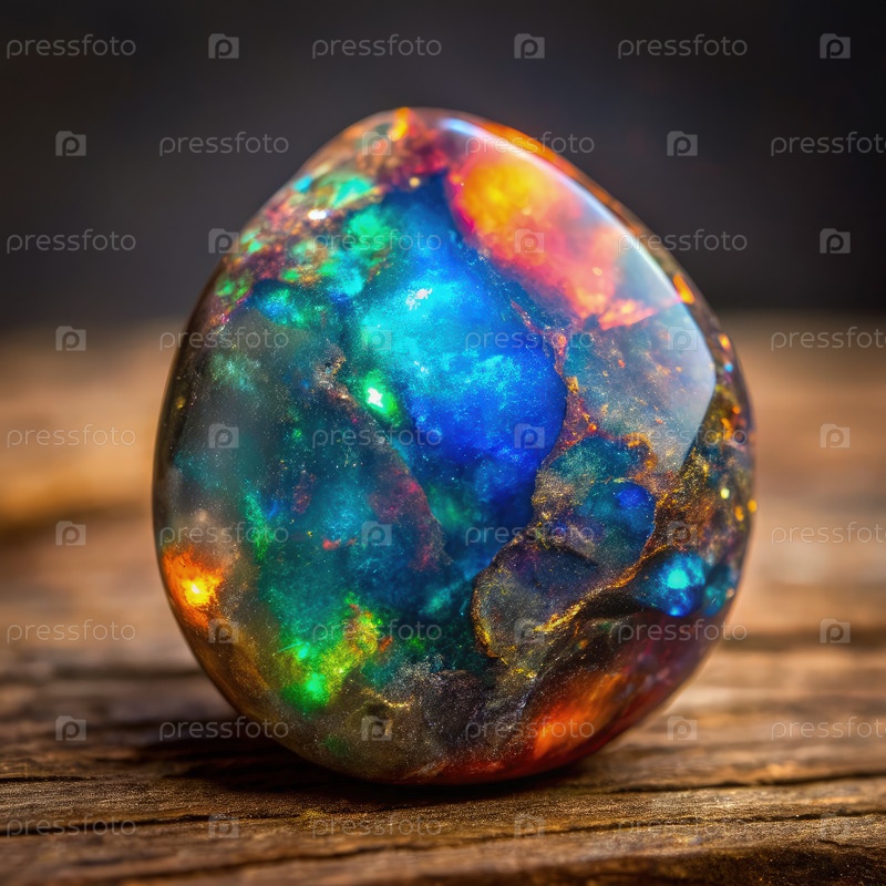 Сырой черный опал, отображающий яркие цвета на деревянной поверхности