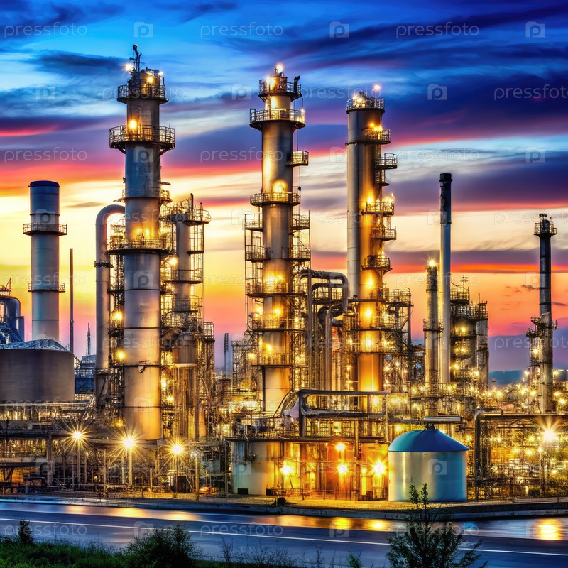Вид высокой четкости нефтеперерабатывающего завода на закате с яркими цветами неба
