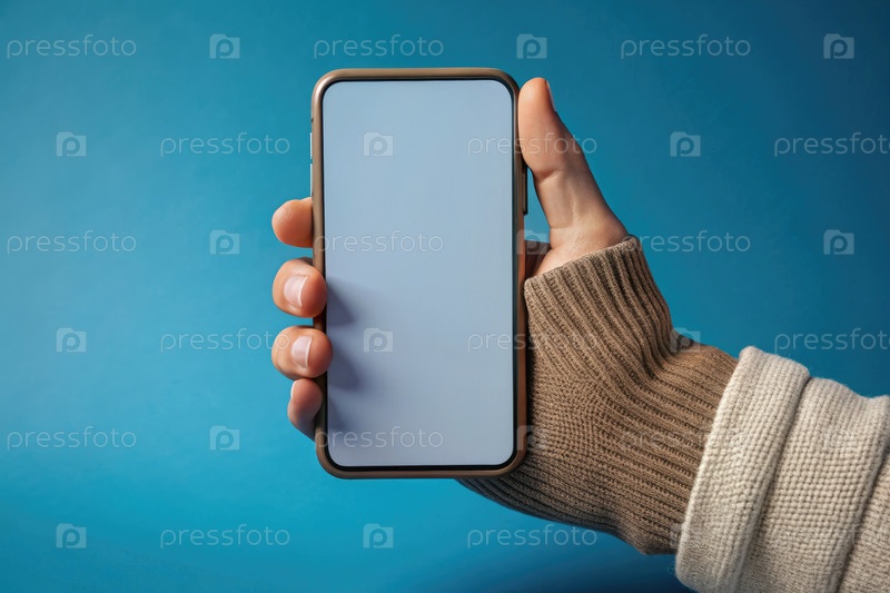 Реалистичное изображение руки, держащей мобильный телефон на синем фоне