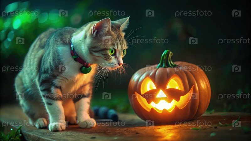 Призрачный кот с ошейником на Хэллоуин наблюдает за светящейся тыквой ночью