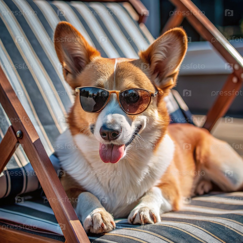 Корги, расслабляющийся в солнцезащитных очках на солнечном летнем дне