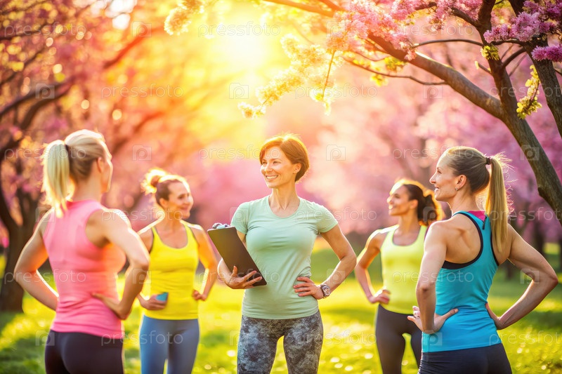 Профессиональный тренер ведет групповую фитнес-сессию в цветущем парке