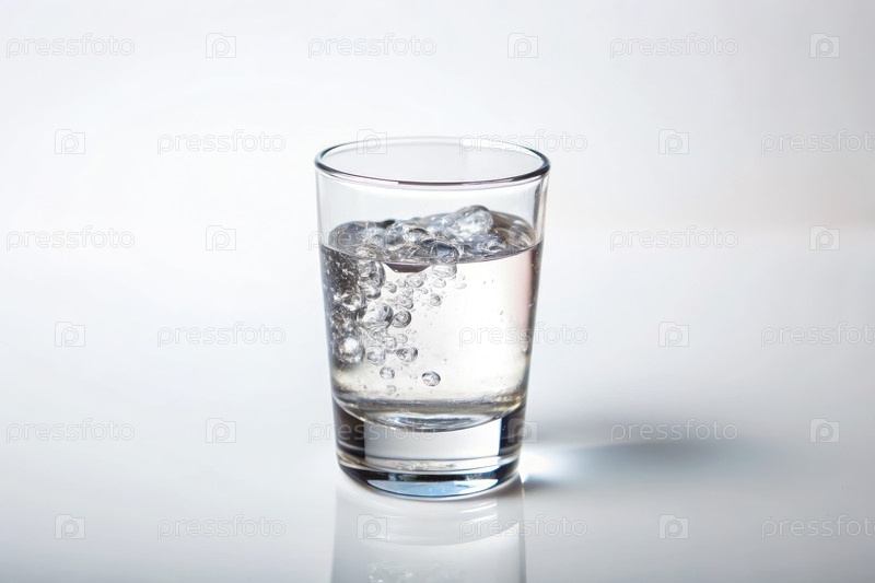 Холодная вода в прозрачном стекле с пузырями на простом белом фоне
