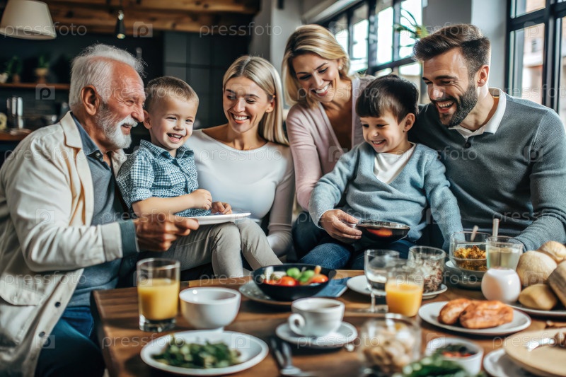 Семья наслаждается завтраком вместе на уютной кухне в воскресное утро
