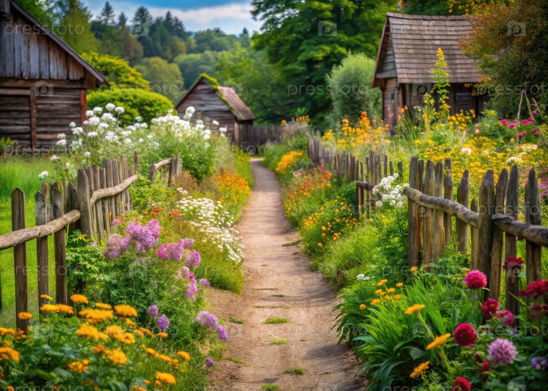 Очаровательный деревенский садовый путь, извилистый сквозь красочные цветы и деревянные хижины