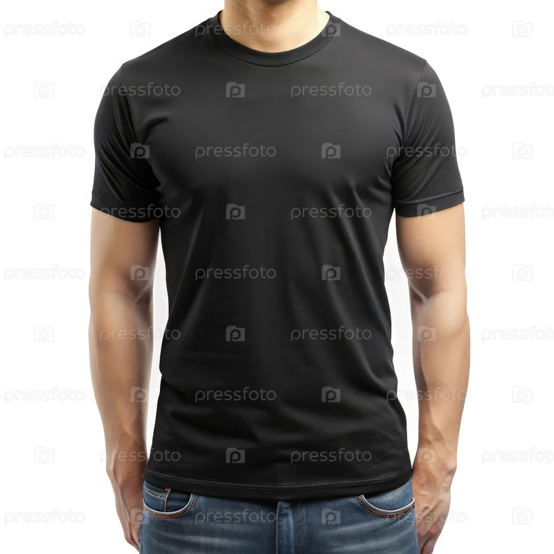Базовая черная футболка, которую носит мужская модель на простом фоне