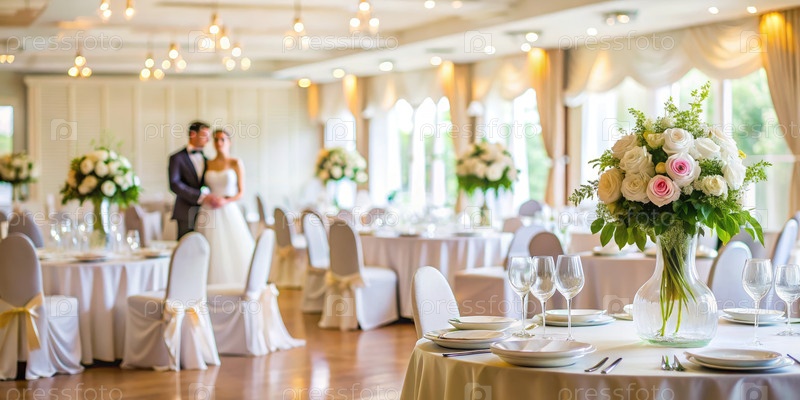 Элегантный банкетный зал, оборудованный белыми скатертями для свадебного торжества