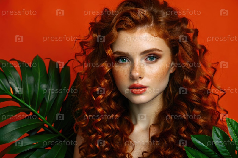 Красивая рыжеволосая женщина в окружении тропических листьев под ярким солнечным светом