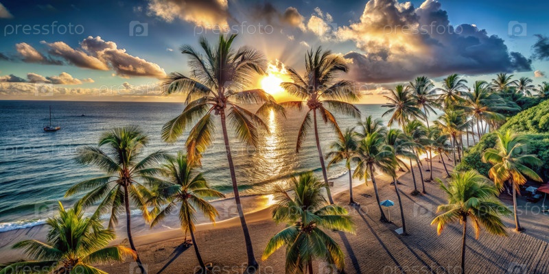Вид с воздуха на тихий песчаный пляж при закате солнца с пальмами и океанскими волнами