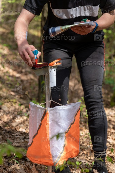 Ориентировщик наносит удар по контрольной точке в естественной лесной среде, держа карту.Это фиксирует навигацию и точность открытого приключенческого спорта