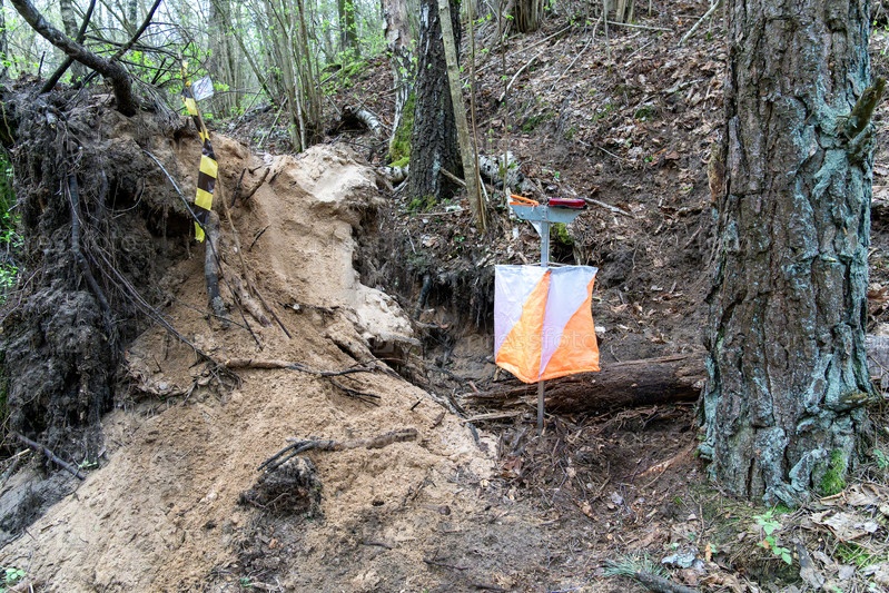 Ориентировочный пункт управления с оранжевым и белым флагом в весеннем лесу. навигационное спортивное оборудование, размещенное среди деревьев для соревнований или тренировки на открытом воздухе