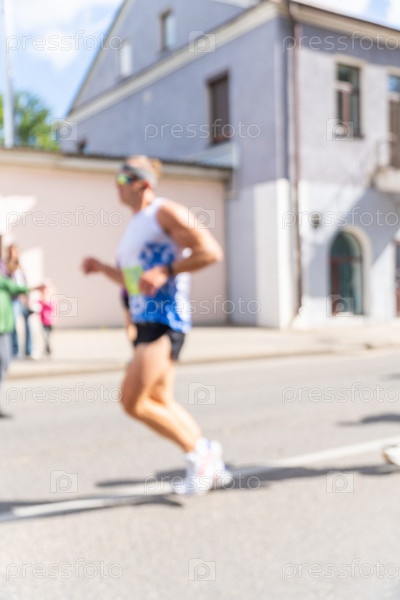 Размытый экшен мужского бегуна в спортивной одежде, бегающего по городской улице во время гонки с зданиями на заднем плане