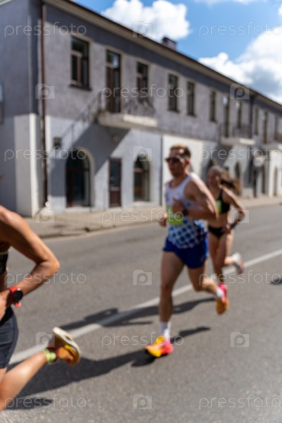 Размытое движение марафонцев, бегущих по солнечной улице города, захватывает скорость и энергию спортсменов, соревнующихся в городском забеге с историческими зданиями на заднем плане