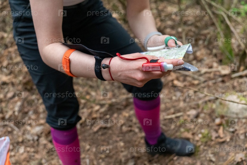 Молодая ориентировщица в лесу, держащая карту и электронную перфорационную карточку возле контрольного флага. носящие розовые носки и компас пальцем, навигация на открытом воздухе