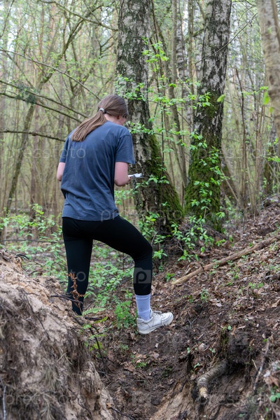 Задний вид молодой ориентировщицы, проверяющей свою карту