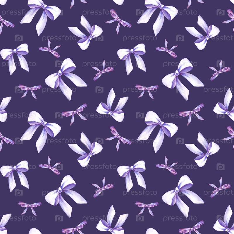 Бесшовный рисунок со светлыми фиолетовыми луками на темном фоне. Илюстрация акварели с реалистичными элементами праздника. Романтический фон с милыми луками для ткани, обоев, упаковки и женских тем
