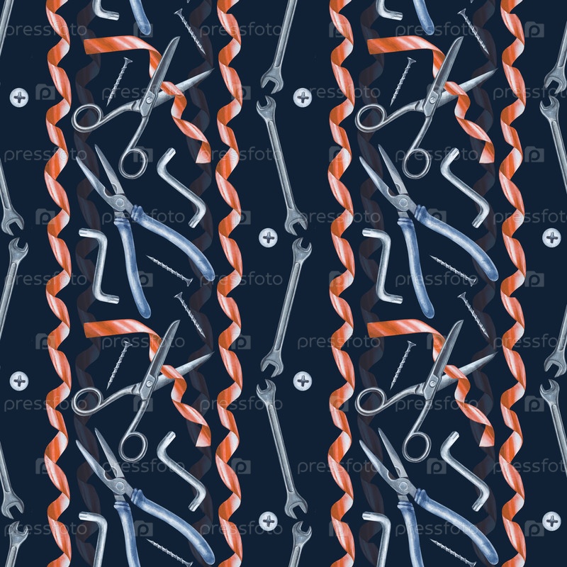 Бесшовный укладка акварели с профессиональными ручными инструментами и праздничные красные ленты на темно-синем фоне с тонкой вертикальной текстурой.Фон для обертки подарков в День отца, декор мастерской, упаковки проектов DIY, промышленных текстилей и ка