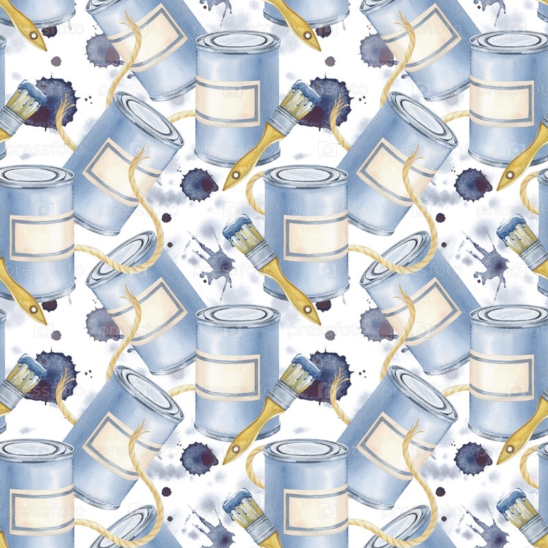 Бесшовный акварельный рисунок с темой строительства и реконструкции. Иллюстрация из баночек краски, деревянные кисти с голубой краской, жютиная веревка и художественные брызги чернил. Изолирован на белом фоне. Для фона блога DIY, брендинга железнодорожног