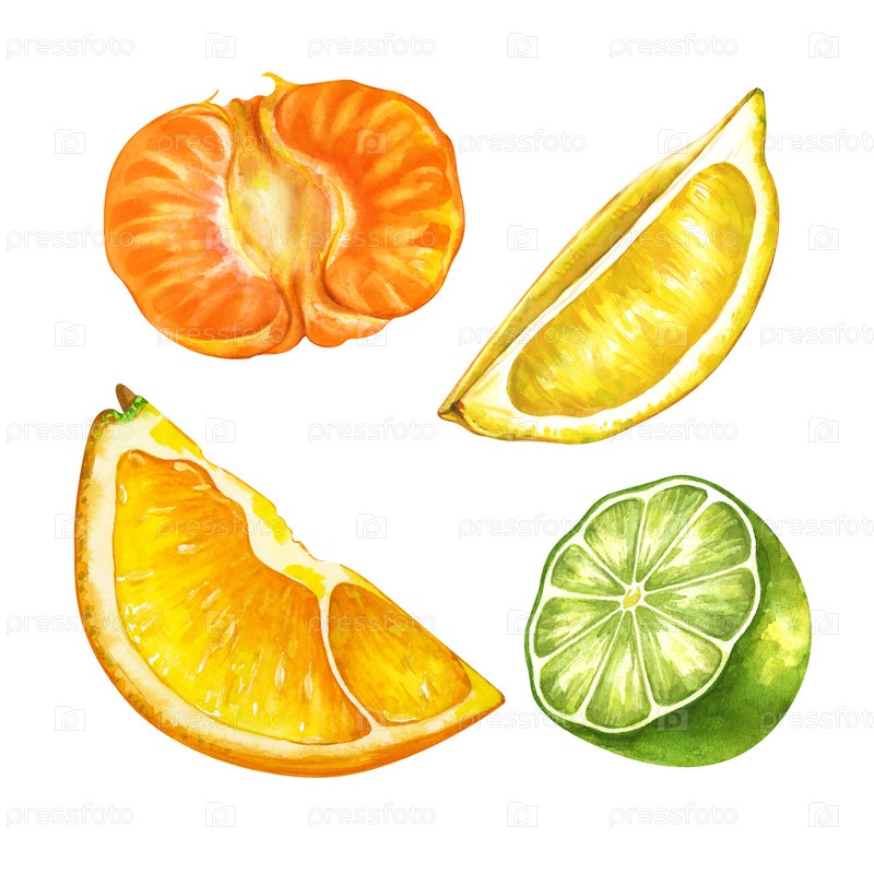 Акварельный набор половин и кусков цитрусовых фруктов на изолированном фоне. Лесочки мандарины, лимона, апельсина и лайма. Реалистичный клипарт для упаковки сока, брендинга здоровой пищи, дизайнов с тематикой лето, декора кухни и иллюстраций рецептов